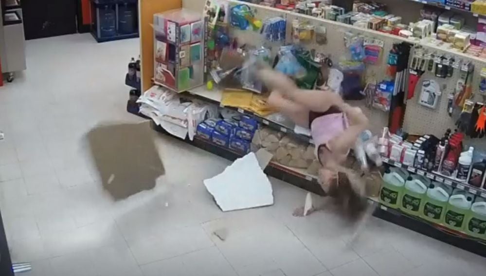 La joven desaparece de las cámaras unos segundos hasta que, de repente, cae desde las alturas en la tienda principal, chocando contra una de las estanterías y dejando los estantes doblado por el golpe. Por supuesto, aturdida y dolorida, la joven no ve más remedio que poner fin a su aventura de espías, entregándose a los alucinados agentes de la ley.
