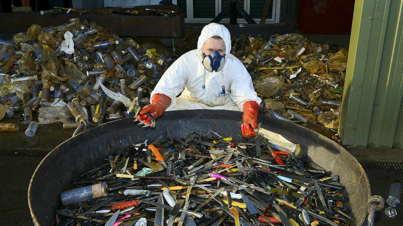 Con un total de más de 7 metro de altura y realizada con la friolera de más de 100.000 cuchillos provenientes de los cuerpos policiales, pero no precisamente los que utilizan los agentes, sino los empleados por los atacantes. Mientras que algunas víctimas y familiares se han ofrecido a entregar el cuchillo con el que fueron atacados e incluso grabar su nombre, otros se han declarado en contra de la obra con la creación de grupos como “dí no al ángel del cuchillo”.